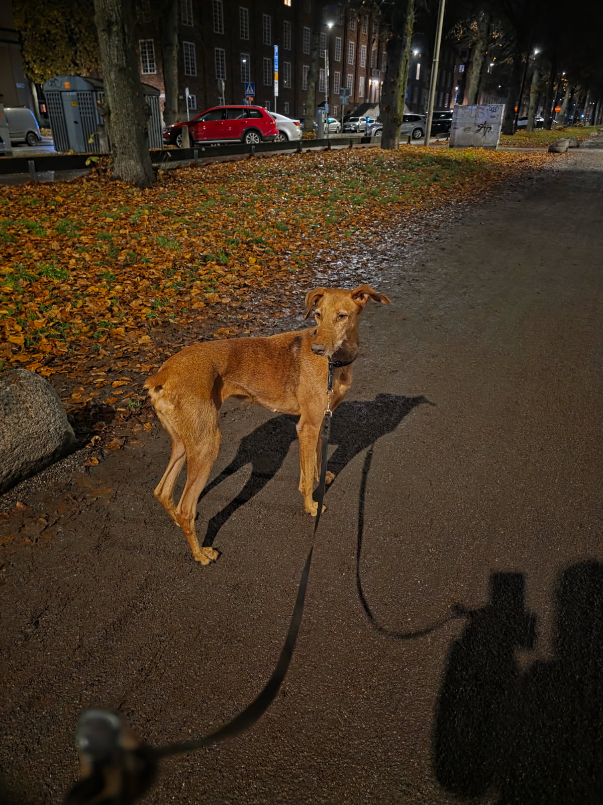 Della älskar att gå ut och kommer glatt skuttandes när hon hör kopplet skramla. Hon har inga problem med påtagning av sele eller skötsel över huvud taget (inklusive kloklippning), utan hon väntar tålmodigt tills man har fixat klart. Promenaderna fungerar utmärkt och hon går förbi andra hundar och människor utan problem. Hon är mycket uppmärksam på sin omgivning när det gäller vilt, och märker direkt om det är något djur i närheten. När det är mörkt kan hon bli stressad om man går nära skogsområden där det finns djur, men det försvinner snabbt när man går bland gator och bebyggelse. Om man bara pratar lugnt och klappar henne långsamt så lugnar hon ned sig.